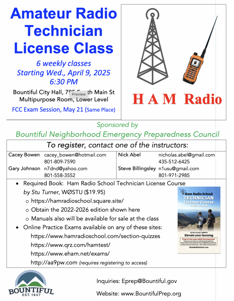 These courses are co-sponsored by the Bountiful Neighborhood Emergency Preparedness Council and the Davis County Amateur Radio Club (DCARC, http://www.dcarc.net)